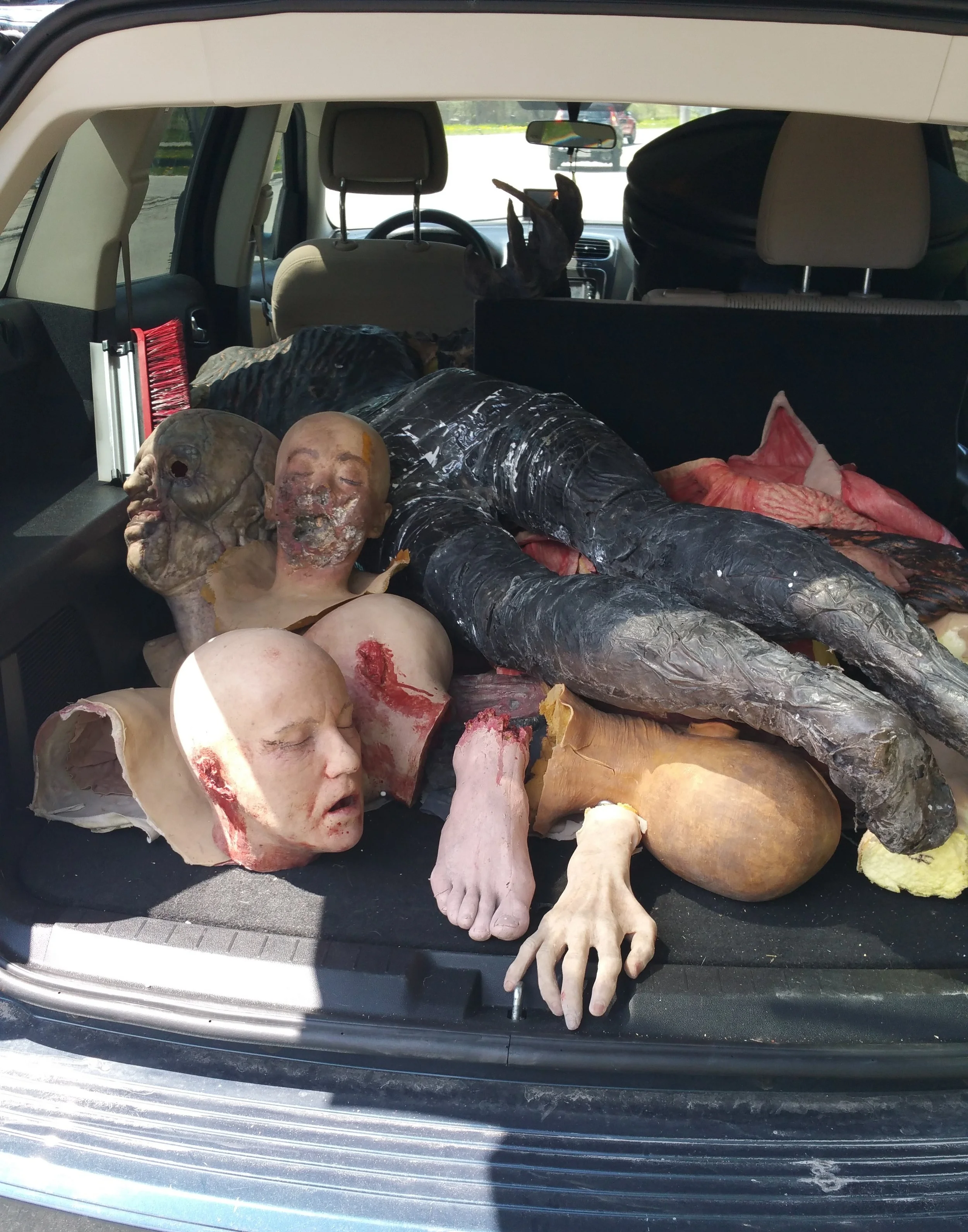 After the puzzles have been decided, it’s time to plan out the build! Building, as I’m sure you can imagine can take some time. Mapping out the space is an important step to the build so that we know where everything will go, and whether there is a need to build any walls within the game space. We also need to consider if we have access to power if there will be tech elements going into the game, and what other things are needed, for example props, furniture, decorations, etc. With so many moving parts, when it comes to actually building the game, planning is one of the most important stages in game development. Check out our haul of props for Coroner's Report before we opened it. Imagine trying to get across the border with all that in your trunk. (Obviously we made it!)